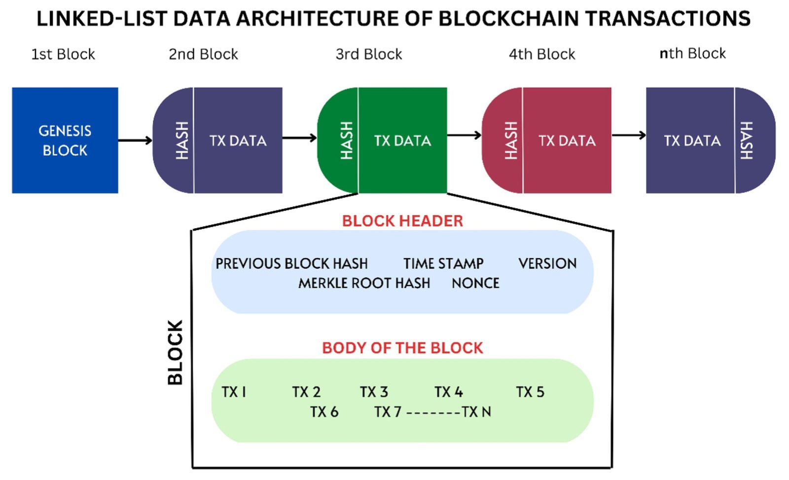 - Chain – A sequence that links these blocks together